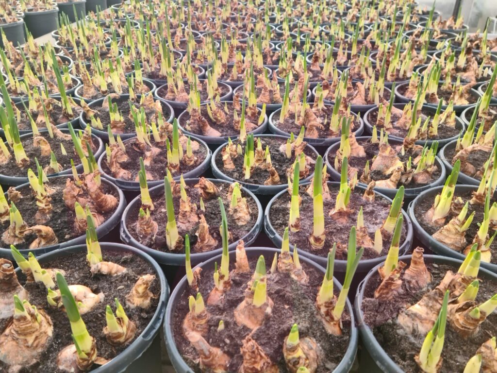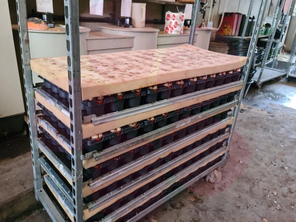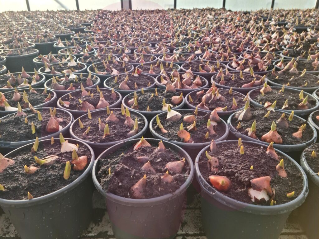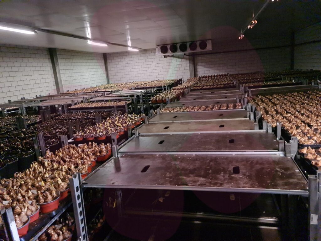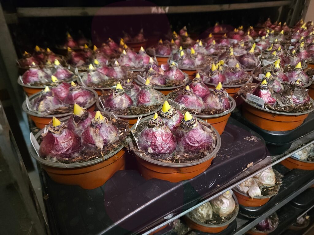 Sobald die Blumenzwiebeln vollständig durchgewurzelt sind, werden die Matten entfernt – die Töpfe bleiben jedoch weiterhin im Kühler. Durch diese Kühlphase wird der Winter für die Zwiebeln künstlich nachgeahmt. Die Pflanzen benötigen diese Kälpeperiode, um ihren natürlichen Rhythmus einzuhalten. Erst nach einer ausreichenden langen Ruhezeit beginnen sie den Austrieb und entwickeln eine Blüte.