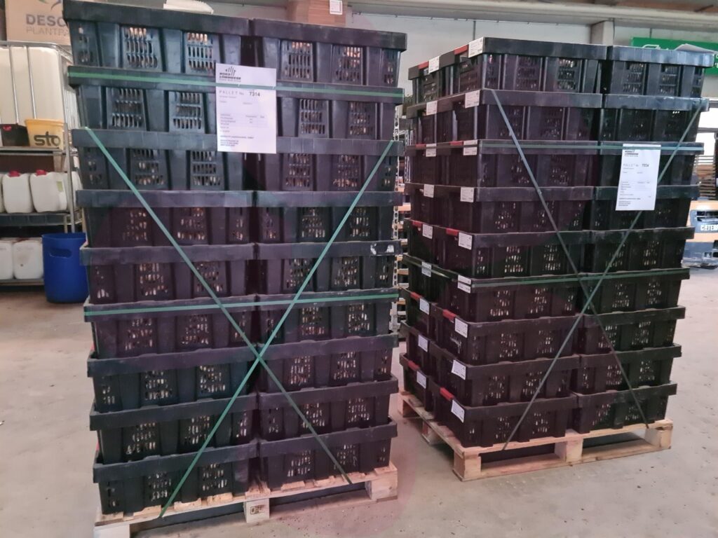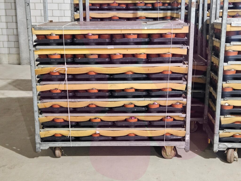 Die frisch bepflanzten Zwiebeltöpfe werden anschliessend auf Container gestellt und mit Matten abgedeckt. Dieser Schritt gehört zu den wichtigsten im gesamten Prozess: Die Matten müssen exakt und gerade auf den Zwiebeln liegen und dürfen, sobald sie aufliegen, nicht mehr bewegt werden. Nur so bleiben die Zwiebeln in ihrer Position. Der Gegendruck der Matten ist entscheidend, damit sich die Wurzeln im Topf verankern können und die Zwiebeln sich beim Wachstum nicht selbst nach oben drücken. Die Zwiebeln werden so in einen angemieteten Kühlraum gebracht.