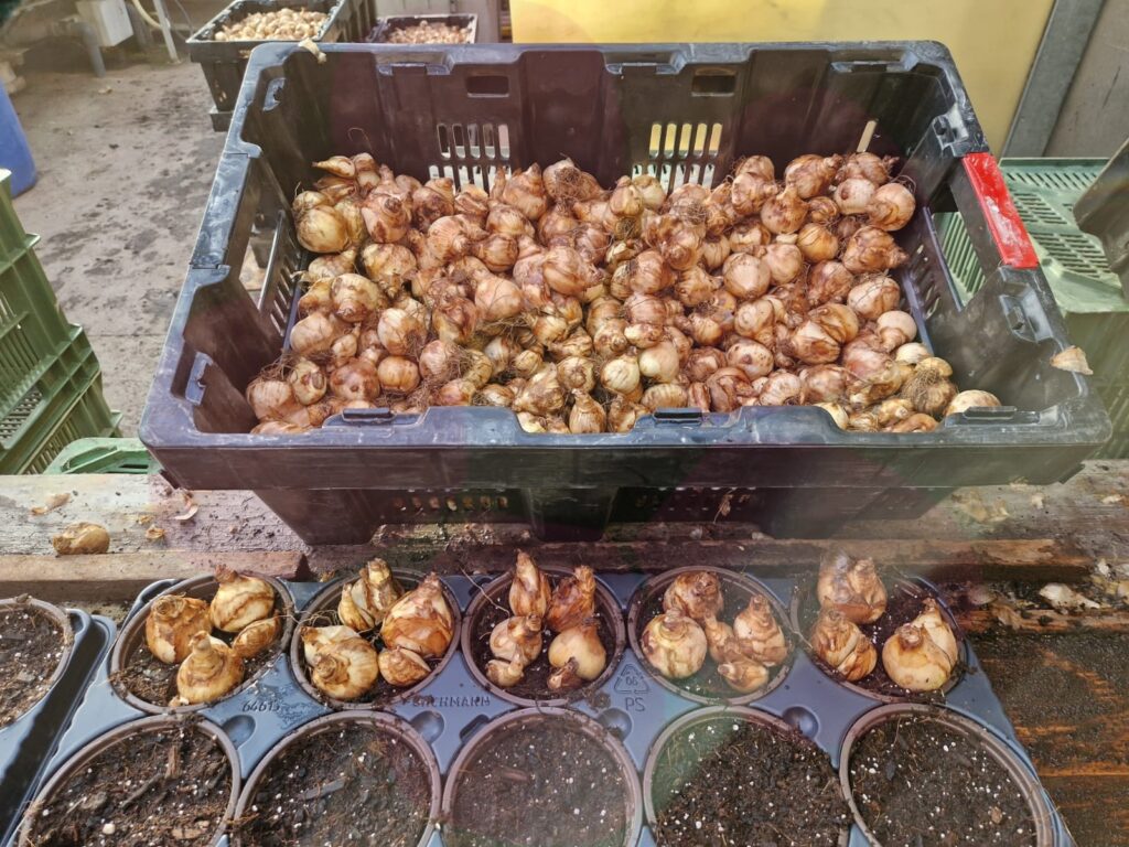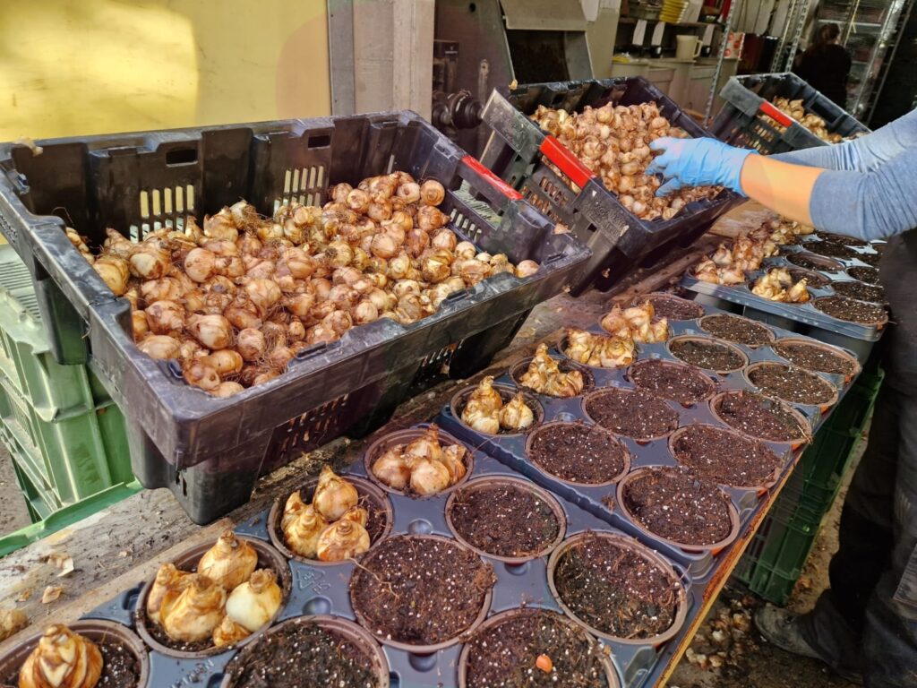 Bei uns angekommen, werden die Zwiebeln in mit Erde vorgefüllte Töpfe gepflanzt. Diese Arbeit erfolgt mit grosser Sorgfalt von Hand: Jede einzelne Zwiebel wird in die Hand genommen und mit viel Fingerspitzengefühl in den Topf gedrückt. Dabei ist auch Aufmerksamkeit gefragt, denn die Zwiebel muss mit der Spitze nach oben und der Wurzel nach unten eingepflanzt werden.