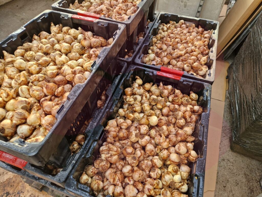 Zwischen Mitte Oktober und Mitte November werden rund 250’000 Blumenzwiebeln zu uns geliefert – lose verpackt in Kisten, bereit für die nächste Blütensaison.