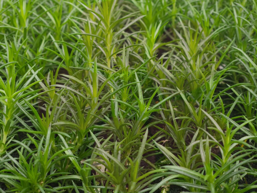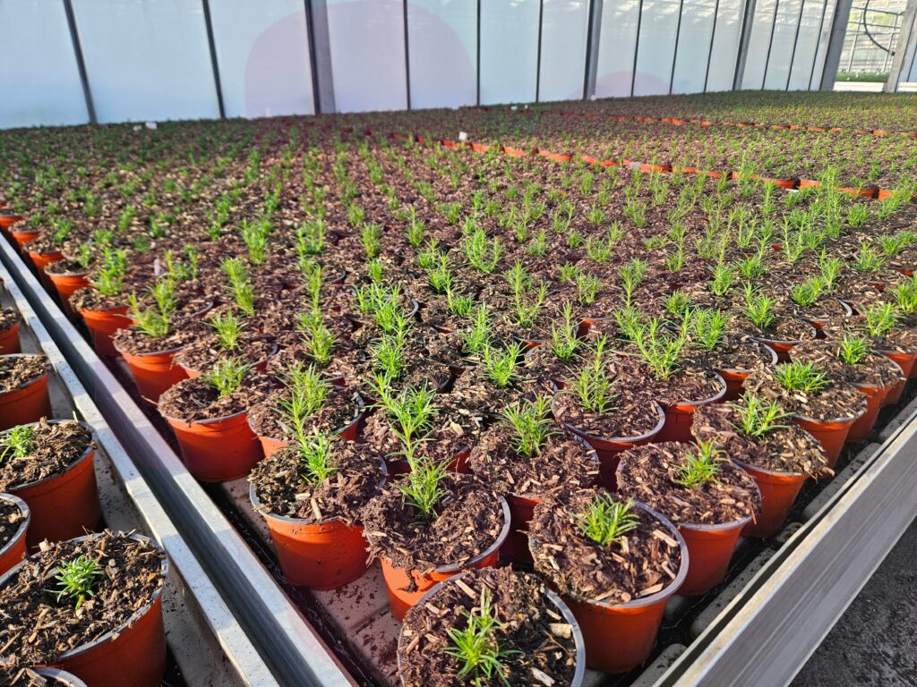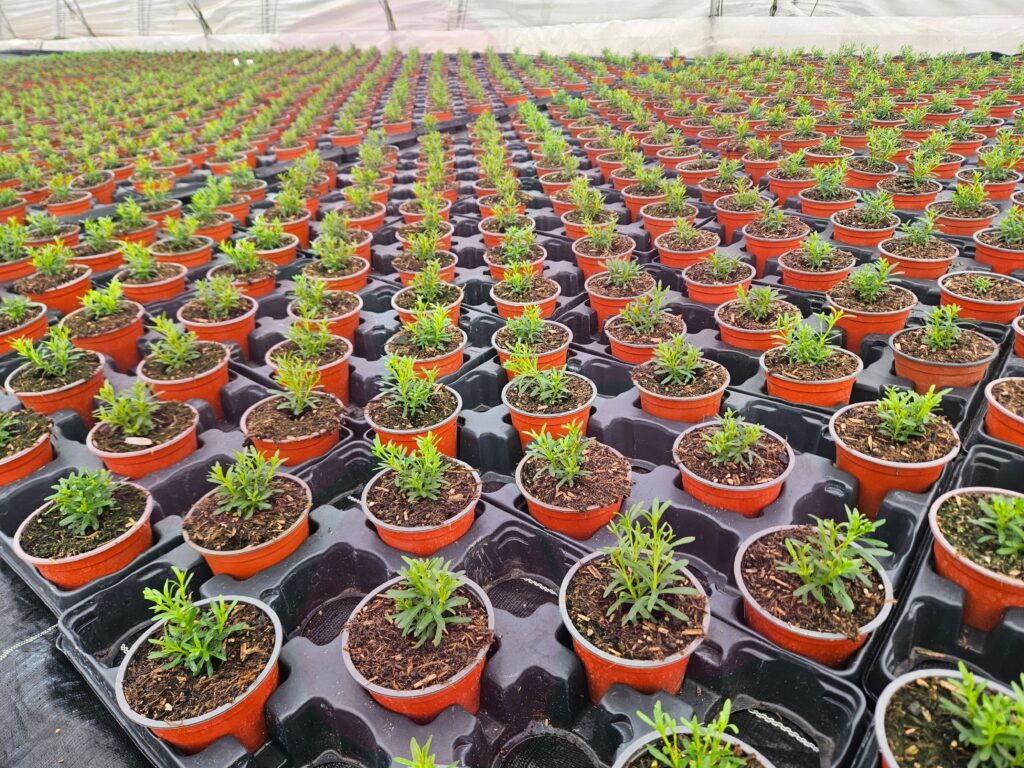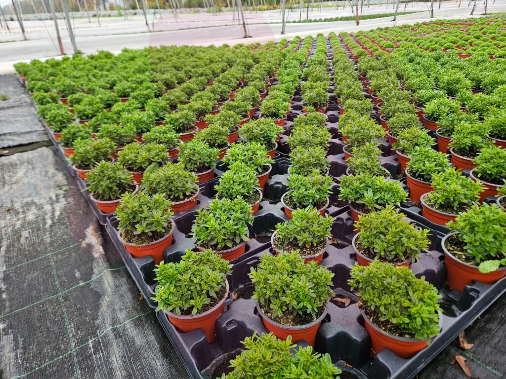 Nach dem Eintopfen ziehen die Polsterstauden in Platten in unseren Folientunnel um. Hier finden sie ein geschütztes Klima, in dem sie kräftige Wurzeln bilden und langsam heranwachsen können – die beste Grundlage für ihre spätere Blütenfülle.